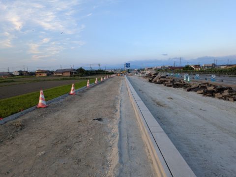 工事の状況ですが、津市での道路建設工事では法面のコンクリート打設も完了し現在側溝、歩車道境界ブロックの据付けへと以降いています。重機と作業員との距離も近く重量物を扱っています。お互い周囲をよく確認し作業を進めて行きたいと思います。
