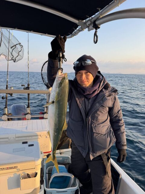 朝に初めて一匹釣り上げましたが、サイズ的にブリではなく大きいのが釣れるとの事でリリースする?と、言う話でしたが持って帰るとに😁。